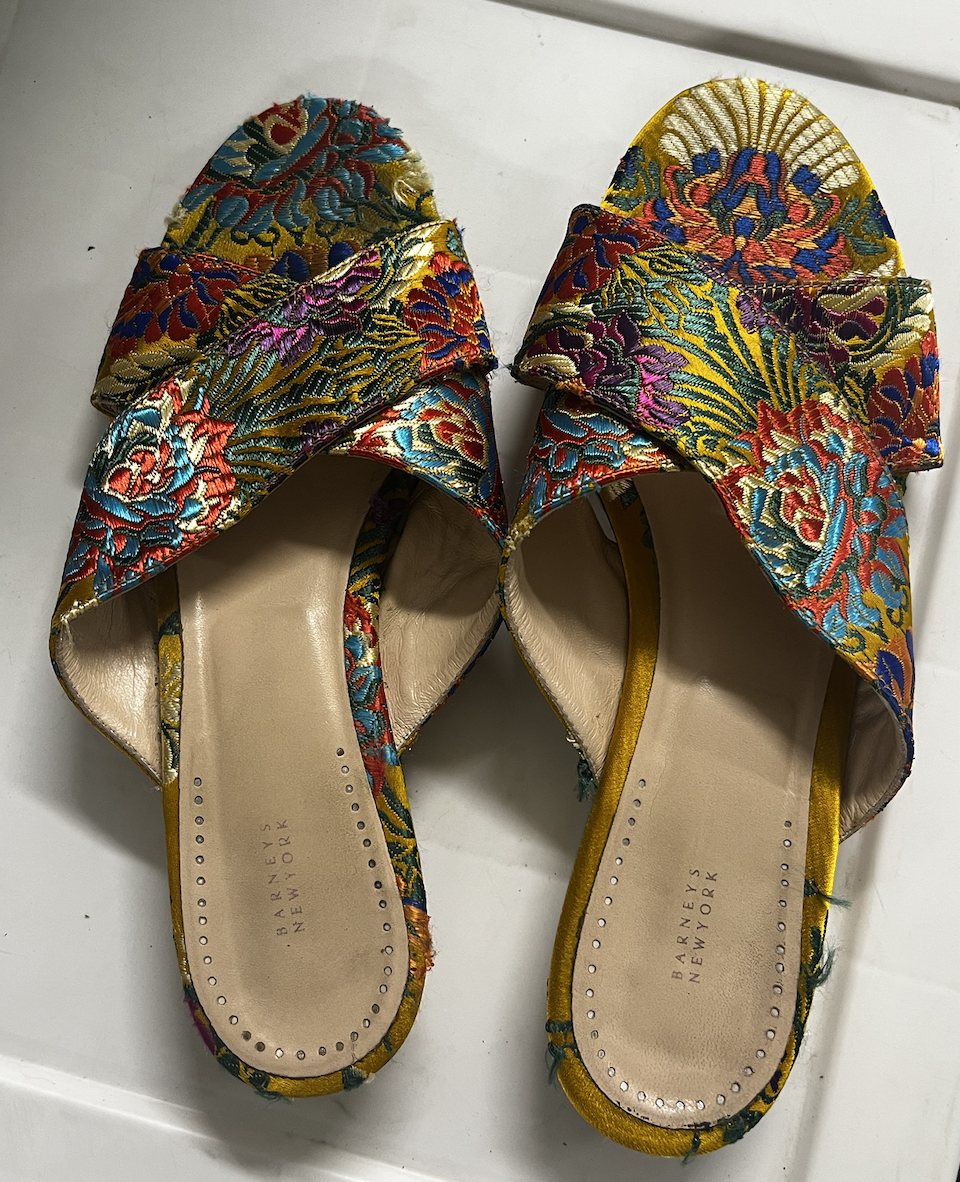 Barney's New York sandals with a brocade fabric. Very chic and luxe. A lovely yellow color.